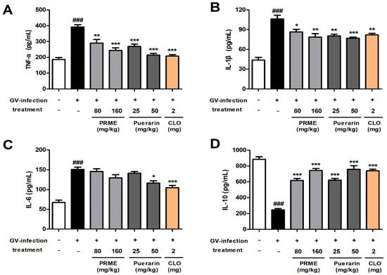 Effect of the PRME extract and puerarin on the inflammation-related cytokine levels in mice with GV-induced vaginitis. (A–D) Proinflammatory (TNF-α, IL-1β, and IL-6) and anti-inflammatory (IL-10) cytokine levels in vaginal tissue lysates from mice. Data are the mean ± SEM of the three experiments. ### p < 0.001 versus the Normal group; * p < 0.05, ** p < 0.01, and *** p < 0.001 versus the GV-infected group.