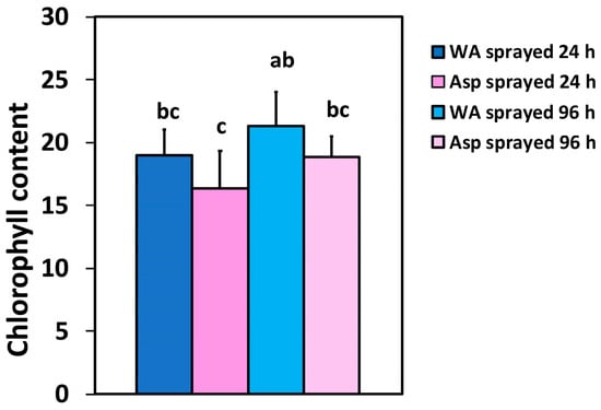 The chlorophyll content of water (WA)-sprayed and Aspirin (Asp)-sprayed leaves 24- and 96-h after the spray, expressed in relative units (n = 10 ± SD). Significant differences are shown by different lower-case letters (p < 0.05).