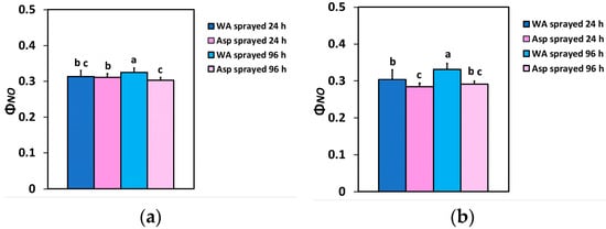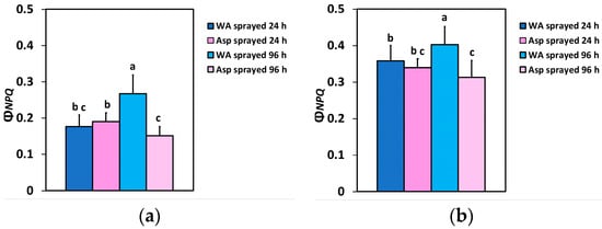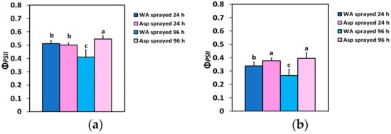 The effective quantum yield of PSII photochemistry (ΦPSII) 24 h after spraying, at the growth light intensity (GLI, 426 μmol photons m−2 s−1), did not differ between WA- and Asp-sprayed leaves (Figure 2a), but at the high light intensity (HLI, 1000 μmol photons m−2 s−1) ΦPSII was 11% higher in Asp-sprayed leaves compared to WA-sprayed ones (Figure 2b). Ninety-six h after spraying, ΦPSII in Asp-sprayed leaves was 33% higher at the GLI (Figure 2a), and 49% higher at the HLI (Figure 2b) compared to the corresponding WA-sprayed ones.