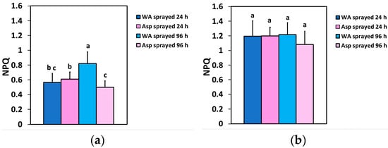 The non-photochemical quenching (NPQ), at the GLI (a) and at the HLI (b) of WA-sprayed and Asp-sprayed leaves 24- and 96-h after the spray (n = 6 ± SD). Significant differences are shown by different lower-case letters (p < 0.05).