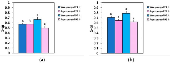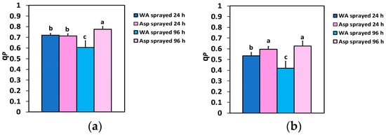 The fraction of open PSII reaction centers (RCs) (qp), at the GLI (a) and at the HLI (b) of WA-sprayed and Asp-sprayed leaves 24- and 96-h after the spray (n = 6 ± SD). Significant differences are shown by different lower-case letters (p < 0.05).