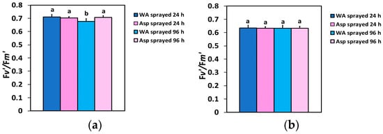 The efficiency of the open PSII RCs (Fv’/Fm’) at the GLI (a) and at the HLI (b) of WA-sprayed and Asp-sprayed leaves 24- and 96-h after the spray (n = 6 ± SD). Significant differences are shown by different lower-case letters (p < 0.05).