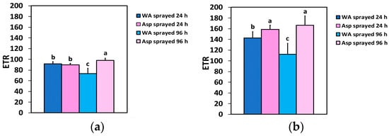 The electron transport rate (ETR) 24 h after spraying at the GLI did not differ between WA- and Asp-sprayed leaves (Figure 8a), but at the HLI, the ETR was 11% higher in Asp-sprayed leaves compared to WA-sprayed ones (Figure 8b). Ninety-six hours after spraying, the ETR in Asp-sprayed leaves was 33% higher at the GLI (Figure 8a) and 49% higher at the HLI (Figure 8b) compared to the corresponding ETR in WA-sprayed ones.