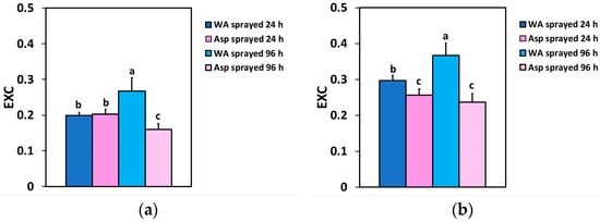 The excess excitation energy (EXC), 24 h after spraying, did not differ between WA- and Asp-sprayed leaves at the GLI (Figure 10a), but at the HLI, the EXC in Asp-sprayed leaves was 13% lower compared to the corresponding WA-sprayed ones (Figure 10b). At 96 h after spraying, EXC in Asp-sprayed leaves was 40% lower at the GLI (Figure 9a) and 35% lower at the HLI (Figure 9b) compared to the corresponding WA-sprayed ones.