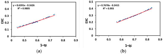 The relationship between the excess excitation energy (EXC) and the excitation pressure at PSII (1 − qL) at the GLI (a) and at the HLI (b) of WA- sprayed and Asp-sprayed leaves 24- and 96-h after the spray (based on the data of Figure 9a,b and Figure 10a,b). Each blue dot represents the paired measurement of the variables, while the red line is the regression line that shows the relationship between the two variables.