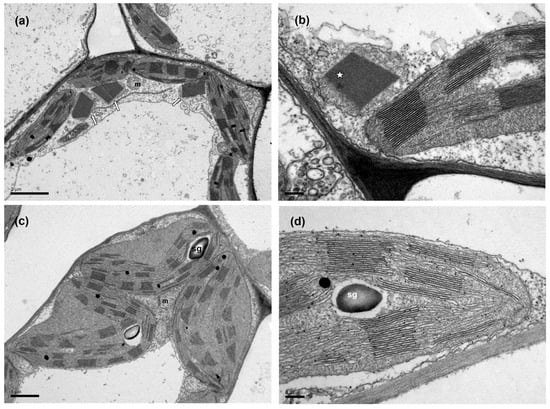 The chloroplasts of leaves sprayed both with water and Asp exhibited well-developed grana thylakoids and frets (Figure 13). However, in WA-sprayed leaves, the chloroplasts were devoid of starch and appeared to be accompanied by numerous peroxisomes, which included prominent electron-dense crystals (Figure 13a,b). On the contrary, in Asp-sprayed leaves, the chloroplasts contained grains of starch, while peroxisomes were not encountered at chloroplast proximity (Figure 13c,d).