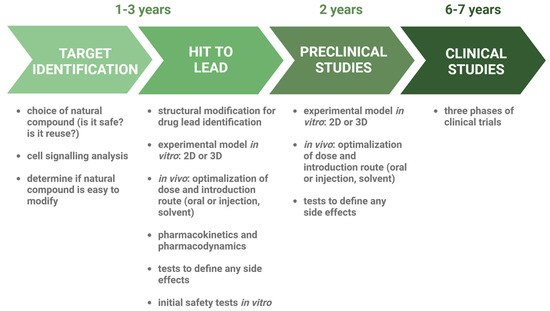 Development of novel anticancer drugs. Stages of drug creation are marked in green arrows. Descriptions of particular steps are provided below the arrows.