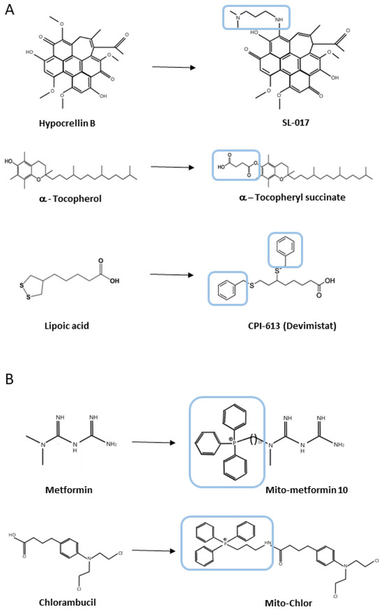 Examples of structural modifications of natural compounds in mitochondrial-targeted anticancer therapy. Direct modifications in structures (A) and conjugates with a TPP moiety (B) are presented.
