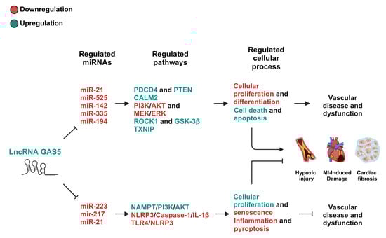 As previously discussed, the GAS5/miR-21 axis has been well defined in cancer studies, and unsurprisingly it has also been a significant area of focus in other areas of biomedical research, such as cardiovascular disease. The aberrant expression of GAS5 and miR-21 is associated with cardiovascular disease and dysfunctions such as cardiac fibrosis [87], acute myocardial infarction [85], increased cardiomyocyte damage and apoptosis [86,89], and the aberrant proliferation and migration of vascular smooth muscle cells [90].