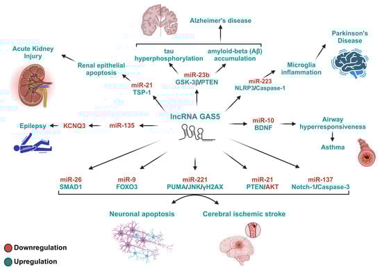 In addition to its detrimental effects in CIS and PD, GAS5 has also been implicated to be involved in the development of other inflammation-related neurological disorders. Most recently, in Alzheimer’s disease (AD) studies, GAS5 has been found to be significantly upregulated in disease models and patient samples, where it exacerbates pathogenesis by acting as a ceRNA, sponging miR-23b-3p. This repression allows for the increased expression of GSK-3β and PTEN, critical mediators of tau hyperphosphorylation, amyloid-beta (Aβ) accumulation, and neuronal apoptosis. The GAS5/miR-23b-3p axis activates a PTEN/PI3K/Akt/GSK-3β signaling pathway, which amplifies AD-associated neurodegeneration and cognitive decline [98]. In the context of epilepsy, GAS5 interacts with miR-135a-5p to regulate KCNQ3, a potassium channel subunit vital for neuronal excitability. The upregulation of GAS5 reduces miR-135a-5p levels, decreasing KCNQ3 expression, which may increase a person’s susceptibility to seizures by destabilizing their membrane potential regulation. The knockdown of GAS5 in epileptic models mitigates seizure frequency and prolongs latency [102]. Additionally, GAS5 has been demonstrated to exacerbate the progress of neonatal hydrocephalus through its ceRNA activity on miR-325-3p, which regulates the expression of chaperonin containing T-complex protein 1, subunit 8 (CCT8), a complex that has been demonstrated to play a crucial role in protein quality control as it relates to neurological disease [116]. Consistently, the knockdown of GAS5 in the context of the inflammation-related neurological diseases appears to have substantial therapeutic potential.