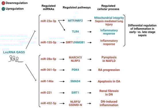GAS5 has been cited to have distinct protective effects in the context of a few other inflammation-driven diseases through miRNA-mediated pathways that suppress inflammation, fibrosis, and apoptosis. For instance, in nonalcoholic fatty liver disease (NAFLD), GAS5 acts as a competing endogenous RNA (ceRNA) for miR-28a-5p, which has been demonstrated to promote pyroptosis through MARCH7-mediated NLRP3 activation, thereby exerting a protective effect [100]. In a similar fashion, GAS5 reduces the severity of rheumatoid arthritis (RA) through sponging miR-361-5p, a process which upregulates PDK4, ultimately limiting synovial hyperplasia and cell proliferation [118]. In osteoarthritis (OA), GAS5 attenuates inflammation-driven chondrocyte apoptosis through the upregulation of SMAD4 via miR-146a sponging [107]. This protective function is further exemplified by the ability of GAS5 to reduce renal fibrosis in diabetic nephropathy (DN) through sponging miR-221, which elevates SIRT1 expression, highlighting its potential role in mitigating fibrosis and promoting cellular homeostasis in the kidney [113]. The GAS5/miR-452-5p axis has also been demonstrated to have a prominent role in reducing the extent of diabetic nephropathy-related inflammation, oxidative stress, and pyroptosis in renal tubular cells [119]. Finally, in renal fibrosis independent of diabetes, GAS5 has been demonstrated to mitigate TGF-β1-induced fibrosis by modulating miR-142-5p through the Smad3 pathway [106].