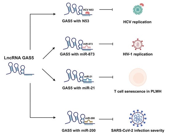 While extensive research shows that GAS5 and miRNAs play important roles in viral infections, the literature exploring their interactions and the implications of these interactions in viral pathogenesis remains limited. GAS5 has been demonstrated to be downregulated in HIV infection [124]. The significance of GAS5 expression in HIV infection has been further elucidated through its role as a sponge for miR-873, which has been demonstrated to significantly alter HIV-1 replication. The upregulation of GAS5 led to a substantial repression of miR-873, resulting in decreased HIV replication. Conversely, the siRNA-mediated knockdown of GAS5 increased miR-873 levels, which correspondingly enhanced HIV infection. Additionally, the overexpression of GAS5 was found to reduce the levels of HIV-1 Gag and Pol proteins, while its knockdown resulted in elevated levels of HIV-1 mRNA. Similar results were observed for the HIV-1 p24 and Tat proteins [122]. In addition to HIV-1 proteins, GAS5 has also been shown to suppress the replication of hepatitis C virus (HCV) infection. By acting as a decoy for the viral NS3 protein, GAS5 directly suppresses HCV replication, thus decreasing the progression of HCV disease [21]. Recent reports also suggest GAS5 deficiency could be a potential biomarker for discriminating between moderate and severe SARS-CoV-2 cases. The downregulation of GAS5 allows for increased miR-200, yielding a reduction in ACE-2 which is linked to increased inflammation and cytokine storms [111]. We have recently reported that GAS5 regulates the function of CD4 T cells derived from people living with HIV (PLWH). Our data showed that increasing GAS5 in CD4 T cells restored T cell functions via repressing miR-21, which acts as an accelerator of apoptosis and senescence in CD4 T cells. Importantly, our study also suggested that in addition to the effect of miR-21-mediated signaling, other miRNAs may play a role in the regulation of CD4 T cell functions [94].