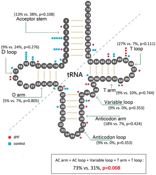 As for the 22 mitochondrial tRNA genes (Figure 1), we found that there were 22 tRNA variants in 15 (42%) of the IPF and 29 tRNA variants in 25 (31%) of the control group (42% vs. 31%, p = 0.346). Of the 15 IPF patients with tRNA variants, four also had COX3 gene NS variants, compared with four in 25 control subjects with tRNA variants (4/15 or 27% vs. 4/25 or 16%, p = 0.502). The average number of mitochondrial tRNA variants per patient in the IPF group was higher than the control group, although not statistically significant (0.6 ± 0.9 vs. 0.4 ± 0.6, p = 0.077; Table S1, Supplementary Materials). Table 3 shows details of tRNA variants, which occurred in all regions of the mitochondrial tRNA clover-leaf secondary structure (Figure 2). The distribution of tRNA variants in these regions was different between the IPF and control group (Table 3; Figure 2). Among the 22 tRNA variants in the IPF group, there were 16 (73%) located in the anticodon (AC) arm, AC loop, variable loop, T-arm and T loop (the right half of the clover-leaf secondary structure), significantly more than the control group (9/29 or 31%, p = 0.008). The average number of tRNA variants in these regions per person was also higher in the IPF than in control group (0.4 ± 0.8 vs. 0.1 ± 0.3, p = 0.004).