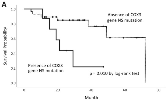 We found that of the nine COX3 gene NS variants that occurred in eight IPF patients, five were insertions and two deletions, leading to frame shift and abnormal or truncated COX3 protein. But because these COX3 gene variants were heteroplasmic, patients harboring the variants probably still had normal COX3 protein [29]. Yet the quantity of normal COX3 protein, the function of complex IV, and the efficacy of ETC would probably be decreased. In the literature, COX3 gene mutations causing COX3 functional deficiency and hereditary mitochondrial diseases such as Leber hereditary optic neuropathy (LHON), encephalopathy, or myopathy have been reported only rarely. Most of these severe mitochondrial diseases with documented COX3 functional deficiency are caused by mutations in mitochondrial tRNA genes [30,31], suggesting that due to heteroplasmy of COX3 gene variants, mere COX3 gene variants may not cause severe, lethal mitochondrial diseases. Although mitochondrial COX3 gene variants are not necessarily lethal, they could affect survival. Mice with COX3 gene mutation (G9384A) had markedly poorer physical performance, more mitochondrial superoxide production in brain slices as stained by MitoSox, a mitochondria-targeted fluorogenic dye, and shorter survival than the control mice [32]. Likewise, our study found that COX3 gene NS variants were associated with poorer prognosis of IPF patients.