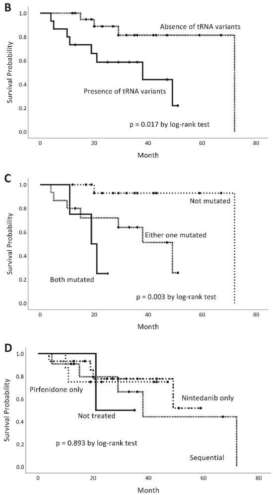 Log-rank test shows that IPF patients with COX3 gene NS variants had poorer survival probability than those without (p = 0.010), and so did those with tRNA variants vs. those without (p = 0.017) (Figure 3A,B). IPF patients who had neither COX3 gene NS variants nor tRNA variants had the best survival probability (Figure 3C). The four IPF patients with both COX3 gene NS variants and tRNA variants had survival probability not different from those with either one alone (Figure 3C). IPF patients who received nintedanib only (N = 15), pirfenidone only (N = 8), the two drugs sequentially (either nintedanib to pirfenidone or vice versa, N = 11), or no anti-fibrotic drug (N = 2), had similar survival probabilities (Figure 3D).