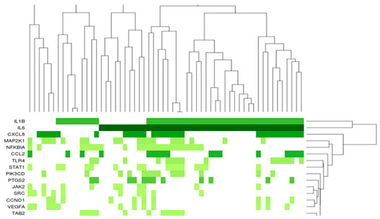 Gene Set Enrichment Analysis (GSEA) confirmed the importance of inflammatory/angiogenic factors in the ASC regulation induced by culture in a gelatin sponge. Three ASC lines from three independent donors were seeded into a porcine gelatin sponge or prepared as single-cell suspensions from a monolayer culture. Full gene expression profiles for each condition were established using the Clariom™ S Assay for humans (ThermoFisher, Waltham, MA, USA) with the Complete GeneChip® Instrument System, Affymetrix. GSEA was performed using Cytoscape 3.8.2 (Moutain view, CA, USA). Shades of green reflect gene expression levels (log-fold changes). Lighter green represents lower log-fold change.