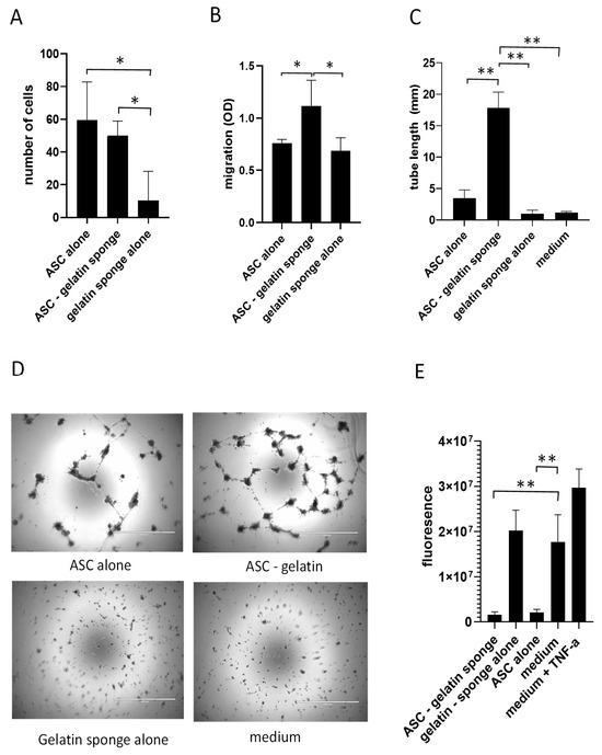 The medium conditioned by ASC/gelatin did not induce any changes in the growth of HUVECs compared to the same number of ASC compacted without gelatin (Figure 5A), indicating no impact on cell proliferation. As expected, the absence of ASC (medium conditioned by an empty gelatin sponge) significantly reduced the growth of HUVEC, consistent with the basal production of endothelial cell growth factors by ASC. The same conditioned media were evaluated for their impact on the ability of HUVEC to migrate through a layer of fibronectin. Compared to the medium conditioned by ASC alone or by an empty gelatin sponge, the medium conditioned by ASC in a gelatin sponge increased their capacity to migrate through a layer of fibronectin (Figure 5B). Compared to the medium conditioned by ASC alone or by an empty gelatin sponge, the medium conditioned by ASC in a gelatin sponge significantly enhanced their capacity to form tubes in appropriate culture conditions (Figure 5C,D). During the angiogenic process and wound healing, endothelial cell permeability is also an important function that undergoes dynamic changes, with both increases and decreases occurring at different stages to either favor inflammatory cell migration (increased permeability) or stability of vessels (decreased permeability). The impact of the differently conditioned media on HUVEC permeability was also studied. A compact monolayer of HUVEC was established and exposed to the conditioned media before measuring its permeability to a fluorescent particle (FITC-dextran). TNF-α, used as an inducer of endothelial permeability, increased permeability to FITC-dextran (Figure 5E). The medium conditioned by an empty gelatin sponge did not induce any change. However, the media conditioned by ASC alone or ASC in a gelatin sponge strongly decreased endothelial permeability in favor of vessel stabilization. Together, these data indicate that ASCs exposed to gelatin, compared to the same number of ASCs compacted without gelatin, do not change their ability to promote endothelial proliferation but enhance their migration and tubulogenic capacities.