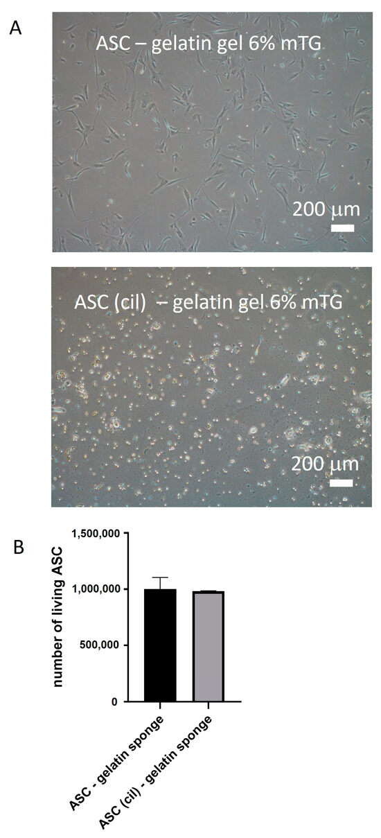 Preparation of gelatin gels: Gelatin powder from porcine skin (Sigma Aldrich (Saint Louis, MO, USA)) was weighed and dissolved in PBS at 50 °C and sterilized as rapidly as possible through 0.22 µm filters. In ASC/gelatin gel binding experiments, gelatin solution was added to microbial transglutaminase (Sigma Aldrich, Saint Louis, MO, USA). In this case, this solution was heated not higher than 70 °C. Ten units of transglutaminase per gram of gelatin was used. Cross-linked gels were incubated at 37 °C for 4 and heat-treated in PBS for 30 min at 65 °C to inactivate the remaining enzyme.
