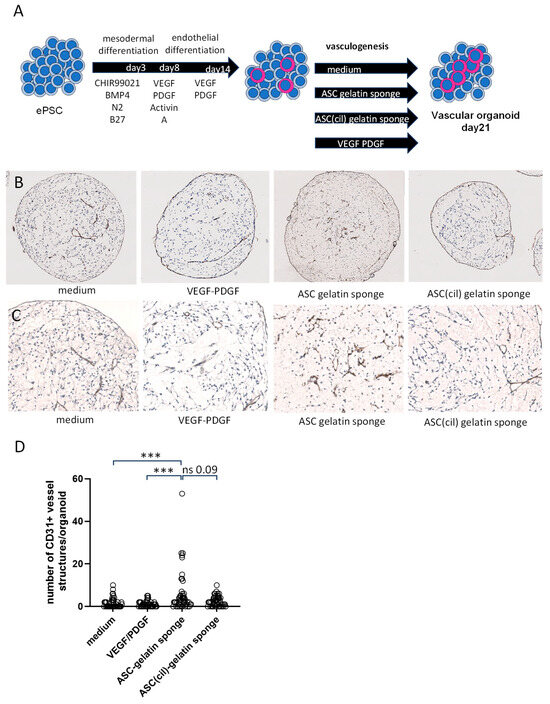 Generation of vascular organoids from embryonic pluripotent stem cells: The human embryonic stem (hESCs) cell line HS420 (Gift from Dr Outi Hovatta, Karolinska institute, Sweden) was cultured in Stemflex medium (Thermofisher) on laminin 521-coated tissue culture flasks (Thermofisher) according to manufacturer’s instructions. The HS420 cells at 70% of confluency were enzymatically passaged using Accutase (Thermofisher, ref 00-4555-56) in Aggrewell TM (Stemcell technologies, Basel, Switzerland) culture plates in Stemflex medium (Thermofisher) supplemented with 1% of PenStep and ROCK inhibitor (Y27632, abcam) at 10 μM. In parallel, ASCs were resuspended in 20 mL of basal vascular medium (IMDM/DMDM F12) for further processing. For the experimental conditions, the cells were prepared to achieve a concentration of 5 × 106 cells/mL. In the gelatin sponge condition, ASCs were added to a gelatin sponge, while the cilengitide condition involved the pre-treatment and rinsing of ASCs by cilengitide, which required incubation with gentle agitation. After one hour of incubation, the cilengitide-treated cells were rinsed with vascular medium, centrifuged, and resuspended in 1.5 mL of the same medium for loading into sponges. The sponges were then loaded with 300 µL of the cell suspension, and 2 mL of vascular medium was added under the inserts to create optimal conditions. Finally, after 96 h, the medium was recovered from the inserts for further use in the culture of vascular organoids. Next, the HS420 cells were deposited in supplemented StemFlex medium within Aggrewell-800™ plates (Stem Cell Technologies, Basel, Switzerland) at a density of 2000 cells per microwell. To ensure the proper distribution of the cells, the plate was gently shaken and placed on a stable support. After 15 min, the plate was cultured at 37 °C for 24 h to facilitate organoid formation. Following this period, the resulting spheres were collected and transferred to a standard 6-well plate containing Dulbecco’s Modified Eagle Medium/Nutrient Mixture F-12 (DMEM-F12, ThermoFisher, Waltham, MA, USA) supplemented with 1% PenStep, 1% B-27 supplement (ThermoFisher, Waltham, MA, USA), 1% N2 supplement (ThermoFisher, Waltham, MA, USA), 8 µM CHIR99021 (Axon Medchem, Reston, VA, USA), and 25 ng/mL BMP4 (ThermoFisher, Waltham, MA, USA). The organoids were then cultured with constant agitation in 3 to 4 mL of medium per well at 37 °C and 5% CO2, using an orbital shaker set at 60 rpm. On day 3, the medium was replaced with a combination of half DMEM-F12 and half Iscove’s Modified Dulbecco’s Medium (IMDM, ThermoFisher, Waltham, MA, USA), supplemented with 25 ng/mL VEGF (ThermoFisher, Waltham, MA, USA), 10 ng/mL PDGF (Cell Signaling, Danvers, MA, USA), and 2 ng/mL Activin A (Cell Signaling, Danvers, MA, USA). From days 7 to 14, the organoids continued to be cultivated in a mixture of half DMEM-F12 and half IMDM, supplemented with 25 ng/mL VEGF and 10 ng/mL PDGF. From days 14 to 21, vascular organoids in the positive control group were maintained in a basal vascular medium composed of half DMEM-F12 and half IMDM, supplemented with 25 ng/mL VEGF and 10 ng/mL PDGF. In contrast, the negative control group had their vascular organoids maintained in the basal vascular medium without any supplements. For the ASC/gelatin sponge groups, the organoids were cultivated in a basal medium that had been conditioned for 96 h, derived solely from gelatin sponge loaded with ASCs or gelatin sponge loaded with ASCs pre-treated by cilengitide. The culture medium was changed every 2–3 days over the 21-day culture period to ensure optimal growth conditions. Morphologically, the organoids should display a clear, defined external layer, which further reflects healthy differentiation and immunostaining for CD31, SMA, and SM22 ensuring vascular differentiation.