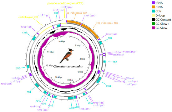 Complete mitochondrial genome organization and gene arrangement of Clamator coromandus. Genes coded on the H-strand are indicated in the outer ring, while the genes coded on the L-strand are indicated in the inner ring. Genes are abbreviated as follows: ATP6 and ATP8 (subunits 6 and 8 of ATPase), COXI − COXIII (cytochrome c oxidase subunits 1−3), Cytb (cytochrome b), and ND1 − ND6 and ND4L (NADH dehydrogenase subunits 1−6 and 4L). Ribosomal RNA of 12S and 16S, D-loop (control region), Trn, and one-letter amino acid abbreviations were used to label the corresponding tRNA genes.
