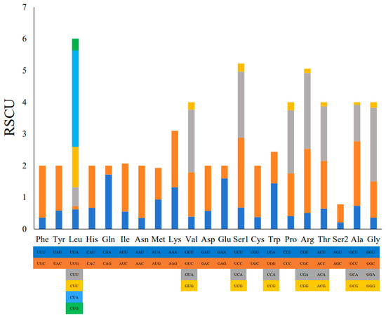 Relative Synonymous Codon Usage (RSCU) in the mitogenome of C. coromandus. The box below the bar indicates all codons encoding each amino acid, and the height of the above column indicates the sum of all RSCU values.