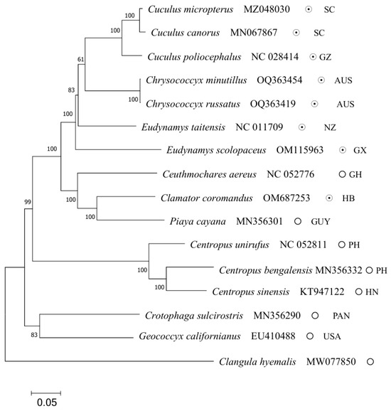 Results of phylogenetic analyses based on maximum likelihood (ML) analyses for 15 Cuculidae taxa based on 13 PCG sequences. Clangula hyemalis (MWO77850) was used as an outgroup. The ultrafast bootstrap values are shown at the nodes. ⊙ represents interspecific brood parasitism, ◯ represents parental care. SC: Sichuan Province of China; GZ: Guizhou Province of China; AUS: Australia; NZ: New Zealand; GX: Guangxi Province of China; GH: Ghana; HB: Hubei Province of China; GUY: Guyana; PH: Philippines; HN: Hainan Province of China; PAN: Panama; USA: United States of America.