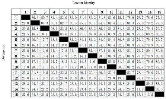 Nucleotide sequence identity alignment of 13 PCGs in 15 species of Cuculidae. The numbers in the 1st ranks and rows of this figure represent the species numbers in Table 1.