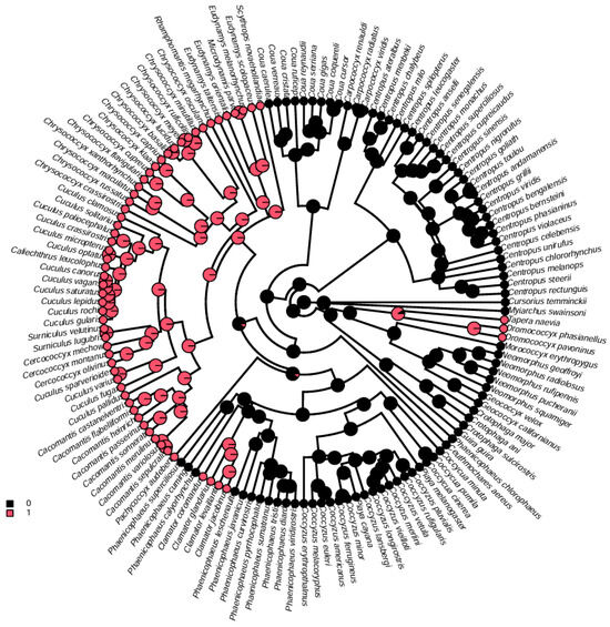The PCGs were extracted from mitogenomes using PhyloSuite v.1.1.16 [57]. Repetitive sequences were removed to obtain a final set of protein-coding regions for constructing the phylogenetic tree. Sequence data were initially aligned using ClustalX 1.83 [58] with default parameters. The mitogenome of C. coromandus was analyzed in this study, along with 14 other Cuculidae mitogenomes retrieved from NCBI GenBank (Table S1). The concatenated sequences of the 13 PCGs of complete mitochondrial genomes were used. The best-fit substitution models (GTR + G + I) of nucleotide sequences were tested using MEGA. We evaluated the confidence of each branch by performing 1000 bootstrap replications. Finally, the trimmed PCGs were concatenated to construct a phylogenetic tree using MEGA. We added the sampling points of species samples on the phylogenetic tree. With the exception of the sampling site for C. coromandus, all other sampling locations for 14 additional cuckoo species were obtained from previous studies [14,15,23,24,59,60]. We download 1000 alternative phylogenetic trees of cuckoos from birdtree.org [61] and constructed a maximum clade credibility tree, which is adequate for addressing phylogenetic uncertainty [62]. The parasitic behavior state of ancestral nodes is considered the response variable, while the parasitic behavior of extant cuckoo species (i.e., non-brood parasitic cuckoos or brood parasitic cuckoos) is considered the independent variable (n = 142 species). We reconstructed ancestral states of brood-parasitism’s presence using the “ace” Function in R package, and our model choice was “ER” (equal-rates model), with the type being discrete character [63]. All 142 species of cuckoos included in the analysis are present in previous studies [3,4,6,41,64]. All analyses were carried out in R 4.3.3 [65] using the R package phytools [66].