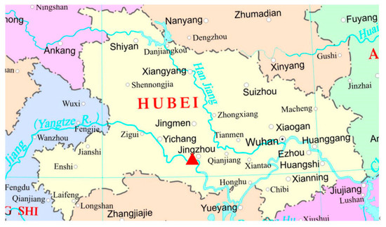 Sampling location map of the chestnut-winged cuckoo, C. coromandus (red triangle represents the sampling point near the east gate of the ancient city, Jingzhou County, Hubei Province of China).