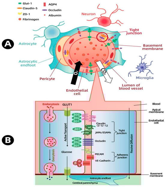 In addition to endothelial cells, pericytes, astrocytes, and the basement membrane (BM) are also crucial elements in maintaining the function and integrity of the blood–brain barrier (BBB). The presence of astrocytic endfeet encircling blood vessels is a characteristic feature of the brain vasculature, emerging during the development of the BBB. Astrocytes can partly activate the barrier function of endothelial cells and are significant in BBB maintenance. Studies have shown that the existence of astrocytes is one of the prerequisites for the formation and maturation of tight junctions (TJs) between brain endothelial cells [30,31]. Moreover, astrocytes secrete several regulatory factors, including TGF-β, GDNF, bFGF, and IL-6 [32]. The basement membrane is a specialized extracellular matrix. Its biological activity is essential for the growth, development, differentiation, and functional maintenance of endothelial cells. Composed mainly of fibronectin (FN), type IV collagen, laminin (LN) linked to collagen, and proteoglycans, the basement membrane helps in positioning cells and establishes connections among endothelial cells, astrocytes, and pericytes. It also functions as an additional barrier to solute movement prior to entering neural tissue [33]. Damage to the basement membrane results in the dysregulation of tight junction protein expression on endothelial cells, leading to changes in blood–brain barrier permeability [34].