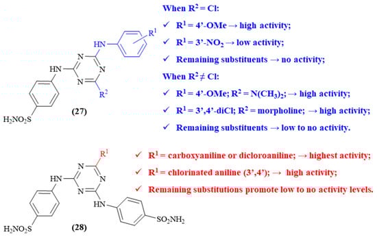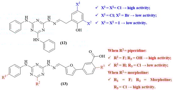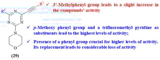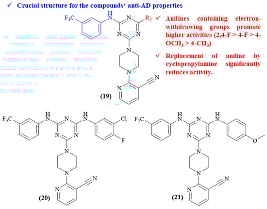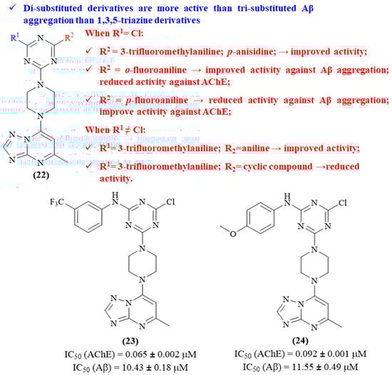 Figure 9). The results demonstrated that, in general, disubstituted 1,3,5-triazine derivatives are better AChE inhibitors than trisubstituted 1,3,5-triazine derivatives. Furthermore, the introduction of a 3-(trifluoromethyl)aniline promotes increased AChE inhibition (IC