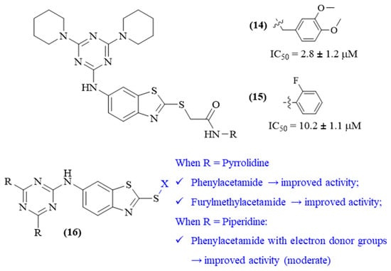 43]. Based on this previous work, another interesting research was performed with the purpose of developing a complete structure–activity relationship study of this particular type of 1,3,5-triazine derivative containing a benzothiazole fragment in one of its positions (