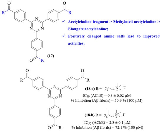 In the same year, another research group designed, synthesized and evaluated a novel series of 1,3,5-triazine-1,2,4-triazine hybrids towards their activity against both AChE and BuChE (