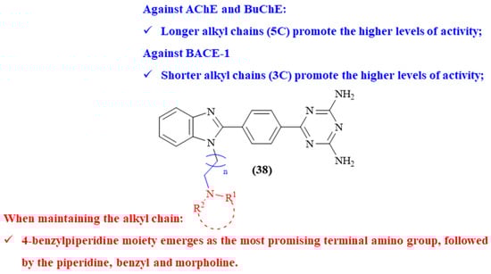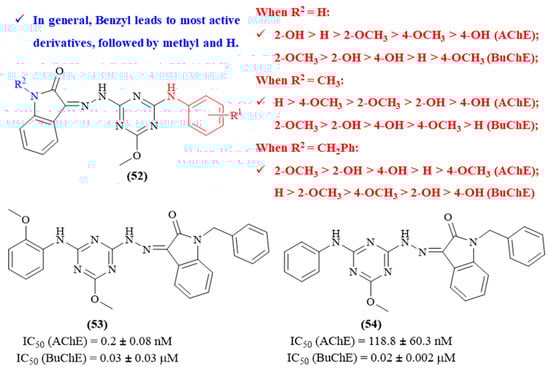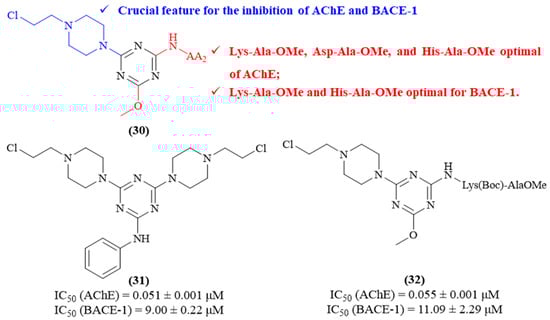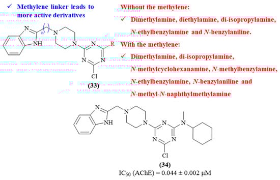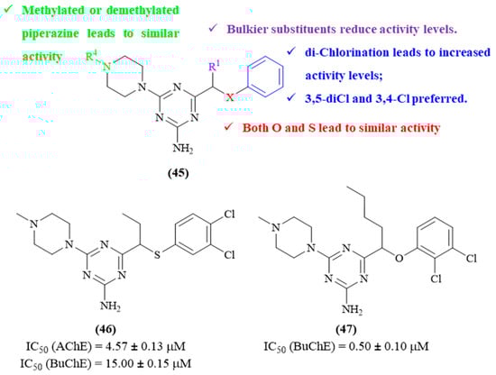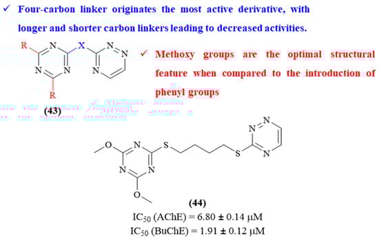 50 values ranging from 1.91 ± 0.12 μM to 27.07 ± 0.24 μM). Structurally, it became clear that the linker length between the two scaffolds considerably affects the compounds’ AChE and BuChE-inhibitory activities, with the most active compound containing a four-carbon linker. Furthermore, the remaining substitutions on the 1,3,5-triazine ring also affect the compounds’ activity, with methoxy groups being the optimal structural feature compared to introducing phenyl groups. In this work, the authors also demonstrated that derivative