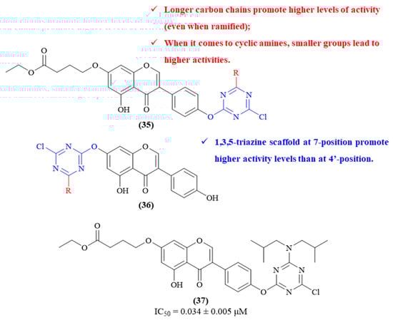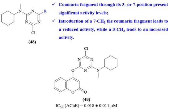 50 0.018 ± 0.011 μM). From a structural perspective, it was possible to conclude that the position from which the coumarin fragment binds to the 1,3,5-triazine scaffold considerably affects the compounds’ inhibitory activity. For instance, the derivative containing the coumarin fragment bond to the 1,3,5-triazine scaffold through its 2-position presents no AChE-inhibitory activity whatsoever, while those containing the same bond through 3- or 7-position present significant activity levels (IC