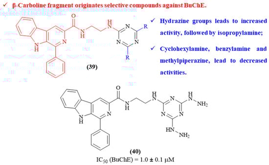 β-carboline fragment produces compounds selective against BuChE, which can be explained by the larger BuChE active site gorge that allows the accommodation of these compounds, in contrast to AChE. Furthermore, considering the other two substitutions of the 1,3,5-triazine scaffold, the introduction of hydrazine groups leads to an increase in the compounds’ inhibitory activity (IC