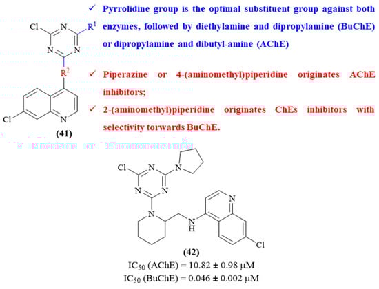 50 21.43 ± 1.53 μM) as the linker between the quinoline and 1,3,5-triazine scaffolds only display activity against AChE. In turn, compounds containing 2-(aminomethyl)piperidine as the linker present inhibitory activity against both AChE and BuChE, with selectivity for BuChE. Regarding the other substitution on the 1,3,5-triazine scaffold, the pyrrolidine group appeared as the optimal substituent group against both enzymes, followed by diethylamine and dipropylamine (BuChE) or dipropylamine and dibutylamine (AChE).