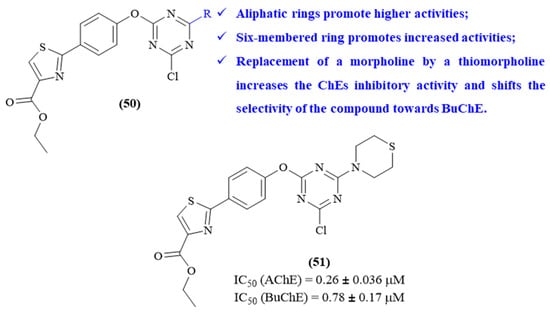 51 as the most active compound against both enzymes. Interestingly, depending on the amino group introduced in the 1,3,5-triazine scaffold (R group), this type of molecule can present selectivity for AChE, selectivity for BuChE or no activity whatsoever. Structurally, verifying that the compound bearing aliphatic rings shows higher activity levels than the analog containing aromatic rings was possible. Furthermore, comparing five- or six-membered ring substituents, in general, the presence of a six-membered ring substituent promotes an increased level of AChE activity. Interestingly, the replacement of the oxygen by a sulfur atom in a morpholine not only increases the ChE-inhibitory activity but also shifts the selectivity of the compound towards BuChE, while the introduction of a di-methylated morpholine fragment leads to an increased AChE-inhibitory activity compared to an unsubstituted morpholine. Once again, the most active derivative was also studied through molecular docking to fully understand the compound–enzyme interactions, showing that this compound interacts with both active sites (PAS and CAS) of AChE. In this case, the phenylthiazole fragment interacts with PHE295, SER125 and TYR124, through hydrogen bonds, and with TYR337 and TYR341 through