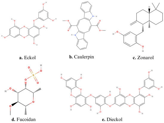 Structures of main algae-derived bioactive compounds: (a) Eckol, (b) Caulerpin, (c) Zonarol, (d) Fucoidan, (e) Dieckol.