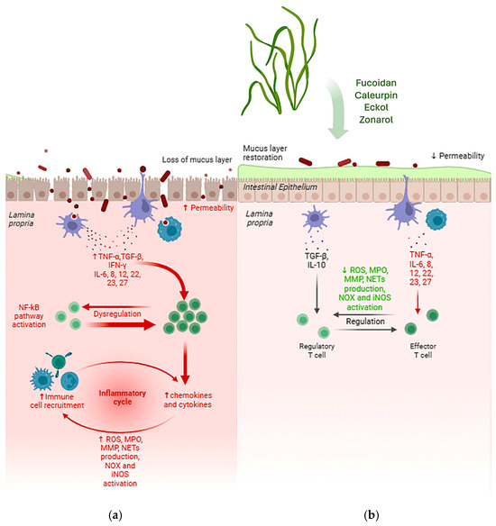 Main effects of bioactive compounds extracted from algae with anti-inflammatory effects. The typical gut affected by IBD produces less mucus, the intestinal epithelium shows increased permeability and the dysregulation of immune cell recruitment leads to increased levels of chemokines and cytokines, which cause a chronic inflammatory response (a). On the other side, after treatment with algal extracts, the mucus layer is restored, reducing permeability and restoring the normal regulation of the inflammatory response, showing decreased production of ROS, MPO, MMP and NETs, as well as the decreased NOX and iNOS activation (b). ↑ = increased; ↓ = decreased.