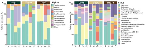 Microbial community composition in jejunal (JE), ileal (IE), cecal (CE) and colonic (CO) mucous of juvenile sika deer on day 1, day 42 and day 70 at the phylum (A) and genus (B) levels.