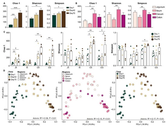 We compared the microbial diversity and found a higher microbial diversity on day 70 than on day 42 or day 1, as indicated by the significant differences of the Chao1, Shannon and Simpson indices (p < 0.05, Figure 2A). In addition, the microbial diversity of the cecal mucosa was significantly higher than that of the ileal mucosa (p < 0.05, Figure 2B). The diversity indices (Chao1 and Shannon indices) of the cecal and colonic mucosa were significantly higher on day 70 than on day 1 (p < 0.05, Figure 2C). The PCoA showed that the microbial communities of the small intestinal (jejunum and ileum) mucosa and large intestinal (cecum and colon) mucosa were clearly separated based on the Bray–Curtis dissimilarity matrix and weighted and unweighted Unifrac distance; the microbial community on day 1 was clearly different from those on day 42 and day 70 (p < 0.01; Figure 2D and Figure S1A,B). Furthermore, the difference between the mucosal microbiota of the small and large intestines was much clearer on day 70 in comparison with day 1 and day 42 (Figure S1C), whereas the separation of the mucosal microbiota on day 1, day 42 and day 70 was more significant in the large intestine than in the small intestine (p < 0.01, Figure S1D and Table S3).