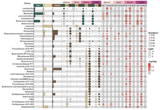We further found that a total of 17, 8, 36 and 34 genera were significantly different in the jejunal, ileal, cecal and colonic mucosa, respectively, among day 1, day 42 and day 70 (p < 0.05, Figure 3 and Tables S4–S7). In the jejunal and ileal mucosa, the relative abundances of Turicibacter and Cellulosilyticum were significantly higher on day 70 than on day 1. Moreover, the relative abundances of Lactobacillus, Lachnoclostridium and Bacteroides in the jejunal mucosa were significantly higher on day 1 than on day 42 or day 70. In the cecal mucosa, the relative abundances of Treponema, Oscillospirales UCG-005 and Peptostreptococcaceae unclassified were significantly higher on day 70 than on day 1. In the colonic mucosa, the relative abundances of Treponema, Romboutsia and Oscillospirales UCG-005 were significantly higher on day 70 than on day 1. In the ileal mucosa, the relative abundances of Lawsonia were significantly higher on day 42 than on day 1.