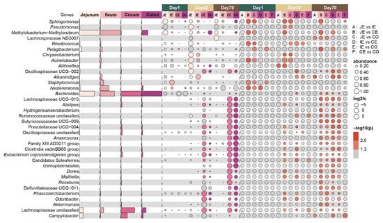 Differences in intestinal mucosal microbiota in different intestinal regions at the same time points. Bar graphs showing the average relative abundances of genera in the jejunum (light pink, JE), ileum (pink, IE), cecum (dark pink, CE) and colon (purple, CO). Bubble graphs showing the significantly changed genera, significance and fold change for different intestinal regions on day 1 (green), day 42 (yellow) and day 70 (brown), respectively.