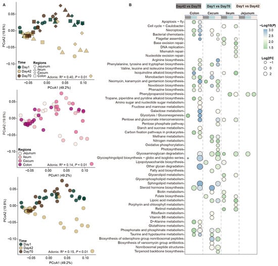 Comparisons of intestinal mucosal microbial function profiles. PCoA results revealing the variation of the difference of the predicted functions of mucosal microbiota in the different intestinal regions and at the three stages at KEGG level 3 based on the Bray–Curtis dissimilarity matrix (A). The significantly different pathways at the three stages at KEGG level 3 (B). The circle size represents the log2 fold change (FC) values of day 42 vs. day 70, day 1 vs. day 70 and day 1 vs. day 42. The circle color indicates the logarithm of p values calculated as the fraction of permutation values. The color legend at the left of the heat map indicates the different comparisons. The significances were determined via a Benjamini–Hochberg-adjusted p value < 0.05 using relative abundances of KEGG level 3.