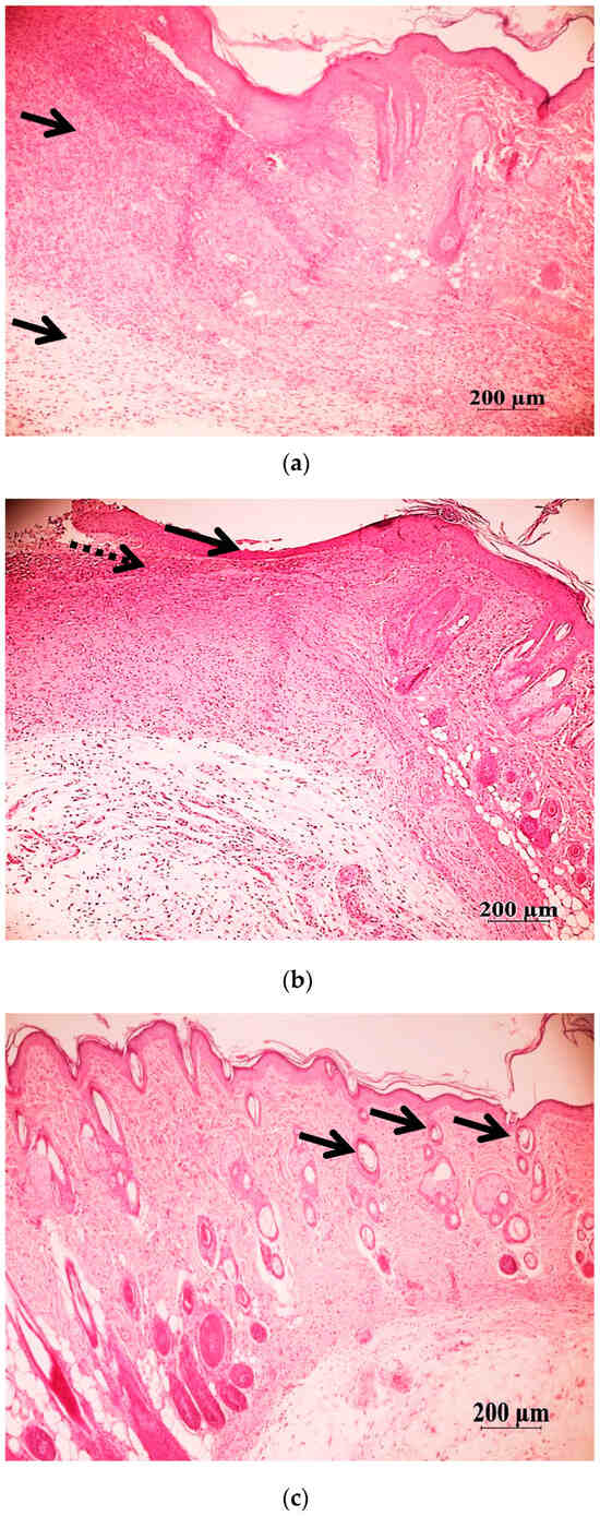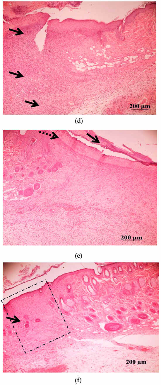 General histological picture in the skin defects at days 5 and 10 of the wound healing. Histological sections of the skin of rats from group O1 (treated with Hestatin 10) and O7 (placebo) in the area of healing defects were stained with hematoxylin and eosin. (a–c) group O1 (Hestatin 10); (d–f) group O7 (placebo). The scale segment is 200 µm, magnification ×50. (a,d) Day 5 of the wound process of the skin: the acute phase of inflammation in the wound area, with diffuse inflammatory infiltration (arrows); (b) on the 10th day, the wound defect is covered with a newly formed epidermis (arrows); the inflammatory infiltrate persists mainly subepithelially (dashed arrow); (e) the wound is covered with a scab (arrow), under which a thin layer of epidermis is formed (dashed arrow); the inflammatory process is noted both in the dermis and in the hypodermis, and the vessels are full-blooded (10th day); (c) on the 14th day, the skin layers in the wound area are fully formed and correspond to the normal structure; there are no signs of inflammation, the hair follicles are densely distributed, and they are in the stage of active growth (arrow); (f) the wound is covered with a thin layer of epidermis, and full-blooded vessels and slightly pronounced infiltration support a pro-inflammatory background, with single hair follicles (arrow), (14th day). The healing defect is marked with a dotted square.
