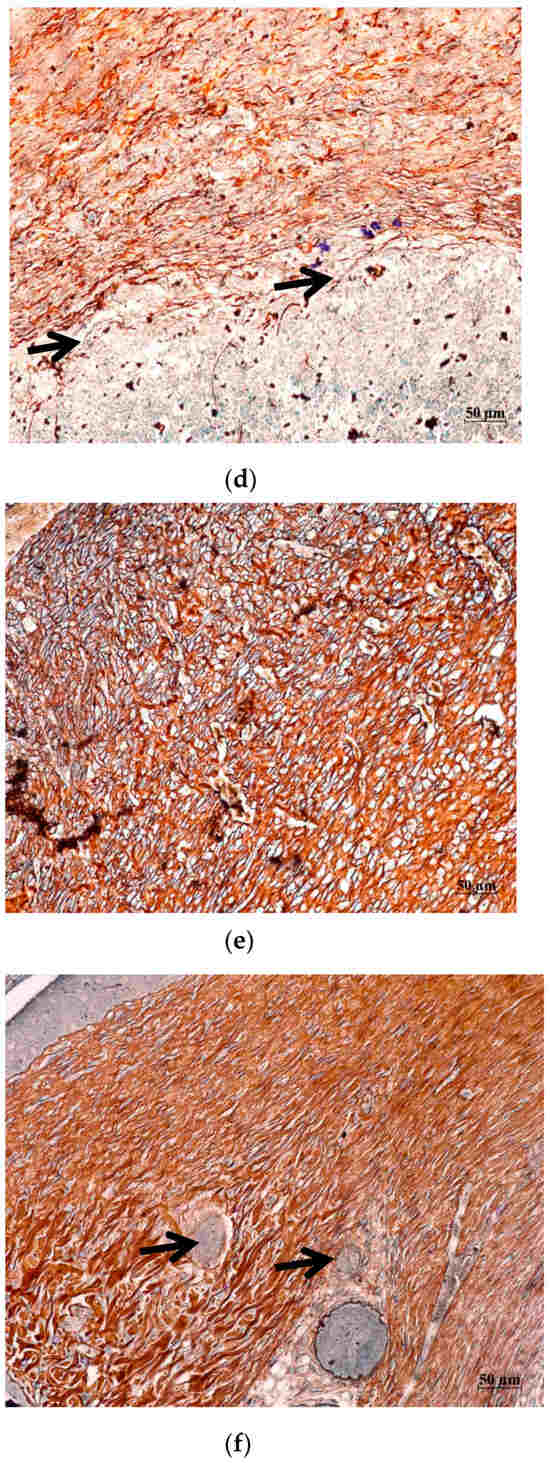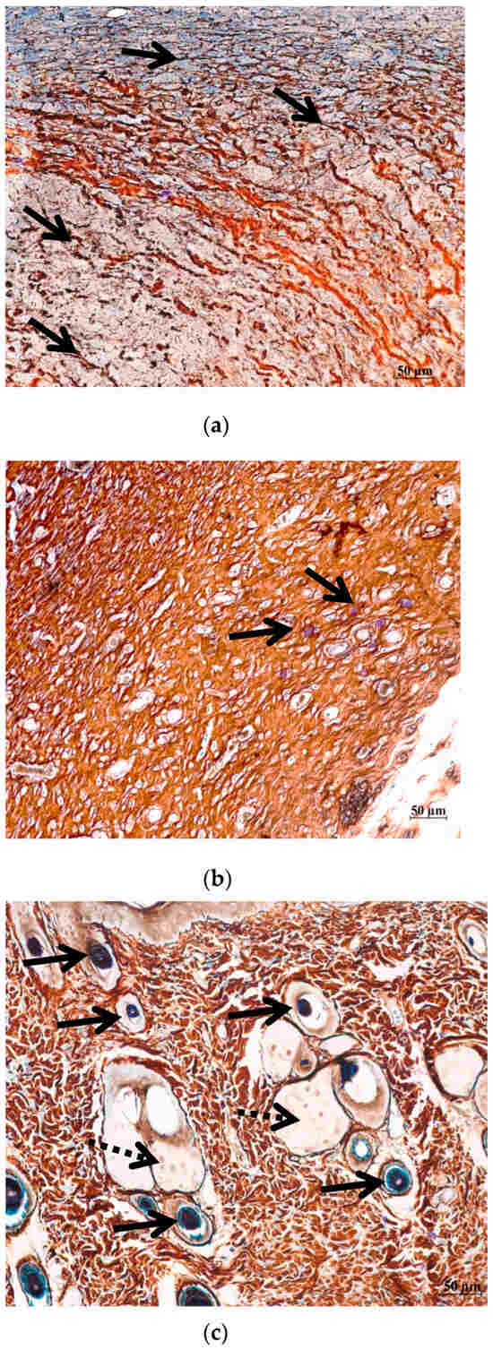 Remodeling of the fibrous component of the skin in different phases of the wound healing ((a,d) day 5; (b,e) day 10; (c,f) day 14). Histological sections of the skin of rats from group O1 (Hestatin 10) and group O7 (Placebo) in the area of healing defects were stained by a combined staining method with ammonium silver and toluidine blue solutions [13]. The scale segment is 50 µm, magnification 200×. (a–c) Group O1 (Hestatin 10); (d–f) group O7 (placebo). (a) Group O1, day 5—dermis of the skin in the wound area, reticular fibers (indicate black staining, arrows) form a fibrous framework, gradually replaced with few thick collagen fibers (indicate brown staining); (b) group O1, day 10—collagen fibers of an ordered orientation predominate over reticular fibers, and MCs are localized in foci (arrows); (c) group O1, day 14—the fibrous framework of the dermis of the skin in the wound area corresponds to the normal structure of the skin, many hair follicles are in the anagen phase (arrows), (active growth phase), and glandular skin structures are formed (dashed arrow); (d) group O7, day 5—few reticular fibers of the dermis (arrows); (e) group O7, day 10—the dermis is composed with scattered reticular fibers, collagen fibers are found in the hypodermic region; (f) group O7, day 14—the fibrous components of the dermis have a tightly ordered structure, and single hair follicles in the telogen phase (resting) occur (arrows).