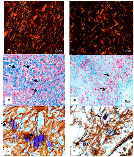 Reparative fibrillogenesis in the skin on day 5 of the wound healing. Histological sections of the skin of rats from group O1 (Hestatin 10) and group O7 (placebo) in the area of healing defects were stained by picrosirius red, picro-Mallory, and by the combined staining method with ammonium silver and toluidine blue solutions [13]. The scale segments are (a–d,f) 20 µm and (e) 5 µm; magnification ×400. (a) picrosirius red, polarization microscopy, group O1—formation of the connective tissue matrix of the dermis of the skin in the wound area, type III collagen fibers are stained with green, and type I collagen fibers are shown in red; (b) picrosirius red, polarization microscopy, group O7—a few thin, short fibers in the wound area, mainly represented by type III collagen (stained with green); (c) picro-Mallory, group O1—Hestatin 10 activates cellular representatives of the fibroblastic differon of the dermis of the skin in the wound area; (d) picro-Mallory, group O7—a few representatives of fibroblastic differon in the dermis; (e) combined impregnation staining with ammonium silver solution and toluidine blue, group O1—MC accumulation with signs of degranulation in the cellular structures of newly formed fibers of the dermis in the wound area; (f) combined impregnation staining with ammonium silver solution and toluidine blue, group O7—MCs with varying degranulation activity in colocalization with reticular (argyrophilic, black-colored) fibers in the wound area, thin reticular fibers in black, shades of brown—collagen fibers. The cellular representatives of fibroblastic differon are shown with arrows.