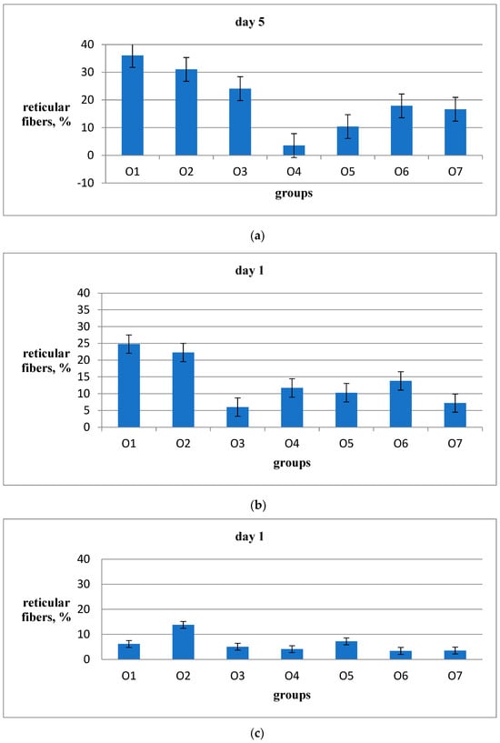 The proportion of dermis volume attributed to the reticular fibers is shown in Figure 6. On the fifth day of the experiment, this proportion increased from 18% in the placebo group O7 to 36% in the Hestatin 10 group O1. This indicates a significant impact of cobalt polyacrylate on accelerating the temporary connective tissue matrix synthesis. A somewhat smaller but still significant effect was observed in the O2 Hestatin 200 group, with the proportion of reticular fibers increasing to 31% of the dermis volume. Table 4 also shows significant differences between the placebo group O7 and PAA group O3 on the 5th day of the experiment. Meanwhile, the use of emulsion wax (group O4) and, to a lesser extent, resveratrol delivered with emulsion wax (group O5), resulted in a noticeable reduction in the proportion of reticular fibers compared to the placebo group (reduced by up to 4%). On the fifth day of the experiment, group O6 (Bepanthen) showed no significant differences from the placebo group O7. Therefore, the quantitative evidence of the wound-healing efficacy of Hestatin 10 and Hestatin 200 suggests that their effects may stem from non-conventional molecular mechanisms different from those of known wound-healing agents.