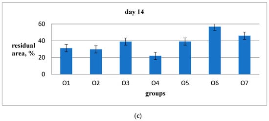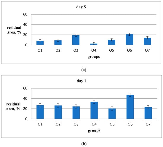 During the observation of wound healing, it was noticed that the peak of the inflammatory reaction occurred on the third day after the wound was inflicted. On the 5th and 10th days, the tissue remodeling phase was observed, and on the 14th day, the restoration of hair follicles was observed. Among the animal groups, O6 (emulsion wax), O5 (resveratrol), and O6 (Bepanthen) showed significantly worse external wound conditions compared to the groups O1, O2, and O3, where aqueous solutions were used. After the application of ointment and emulsion, the rats exhibited more restlessness and engaged in active grooming to clean the wounds and remove the applied substances from their fur. In the O5 group (resveratrol), the scabs were the most combed and visually larger, resulting in slower healing. By the 11th day of the experiment, there were no scabs on the wounds in groups O1, O2, O3, and O7, and the scars from the wounds were barely noticeable. In the examination of sections stained with hematoxylin and eosin, a significantly higher density of hair follicles was observed in animals of groups O1 (Hestatin 10) and O2 (Hestatin 200) compared to the placebo group (O7). Additionally, photographs of wounds at various periods of the experiment and primary measurement data of the residual area of the defect are provided in the Additional Materials. The results of the wound healing rate calculations are presented in Table 3 and Figure 1.